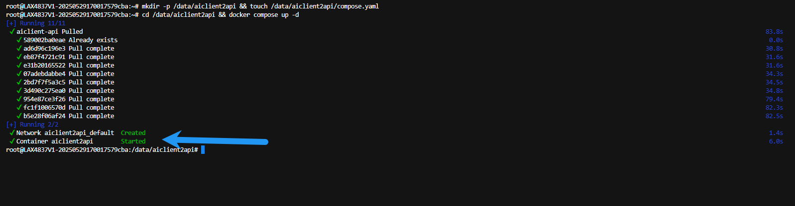 运行如下命令 cd /data/aiclient2api && docker compose up -d ,创建容器,如图即为成功