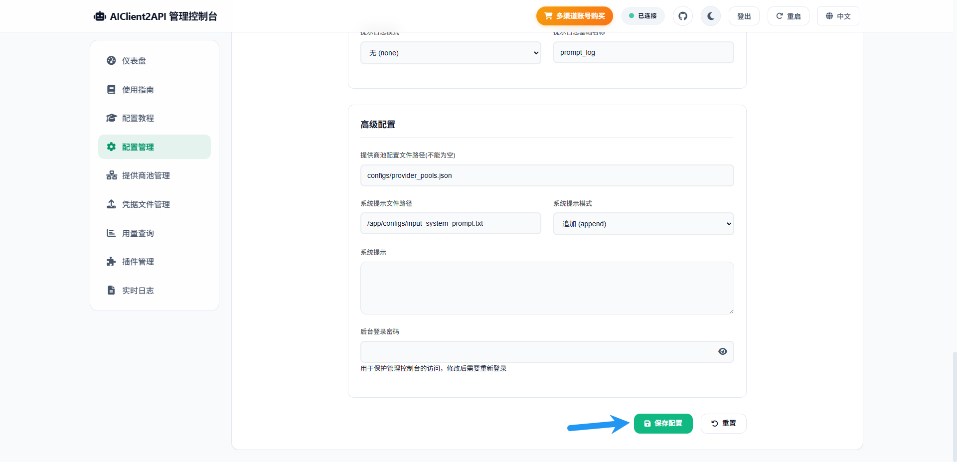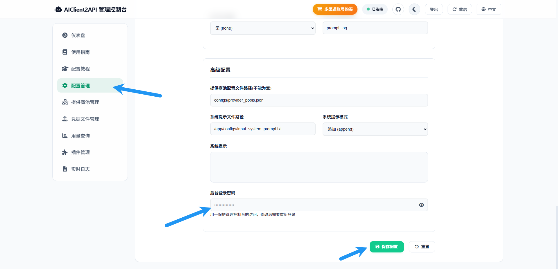 首先要修改登录密码,点击 配置管理 ,滑动到最下面,修改后台登录密码,点击保存配置