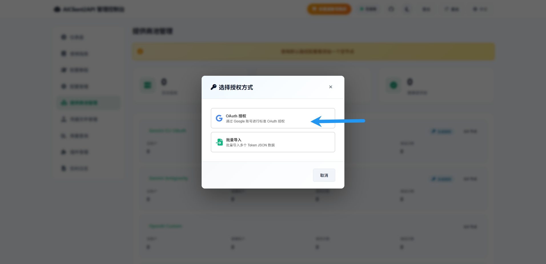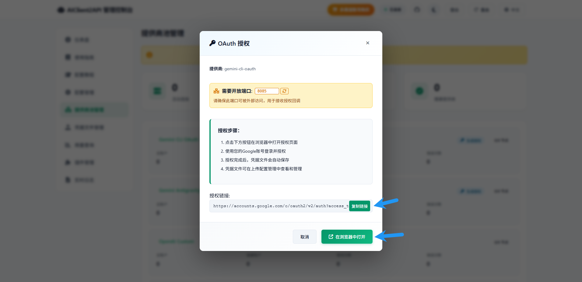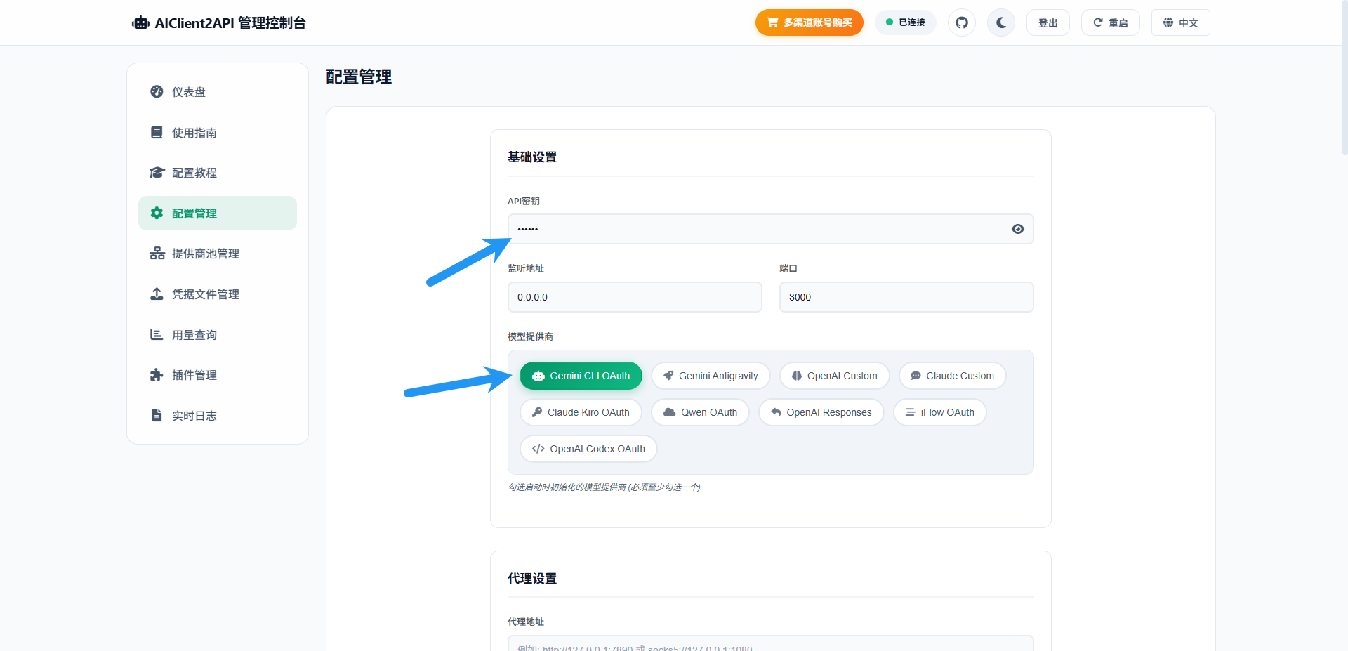 接下来点击配置管理,将API密钥随意修改为你想要的,下面的模型提供商把你对接了的都选上(本文只对接了一个 Gemini CLI 所以暂时只选这一个)