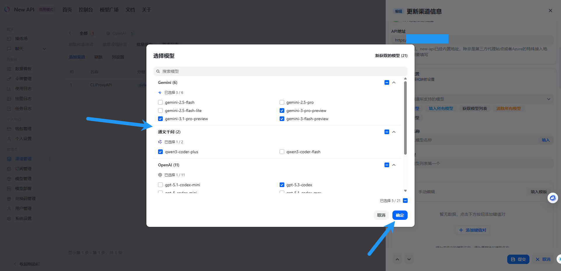 可以看到我们用CLIProxyAPI反代出的所有模型,选择自己需要的模型,点击确定