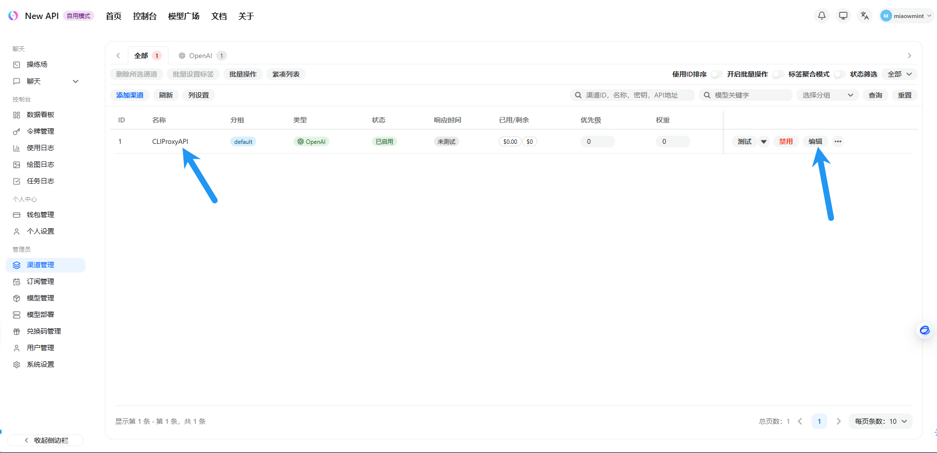 类型默认 OpenAI ,名称随意,填写在CLIProxyAPI配置的密钥,API 地址填写 CLIProxyAPI的服务器IP:端口,或是你反代CLIProxyAPI的域名(一定要注意,地址的最后不要带 / 或者 /v1 ),模型处可以暂时直接点击 填入相关模型 ,点击提交