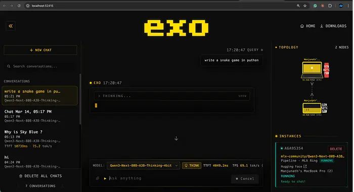 Exo是我遇到的最实用的开源AI工具之一。入门门槛极低——尤其是在Mac上——而上限却极高。两年前,在连接到同一WiFi网络的两台笔记本电脑上分布式运行一个具备思维能力的800亿参数模型,听起来就像科幻小说。