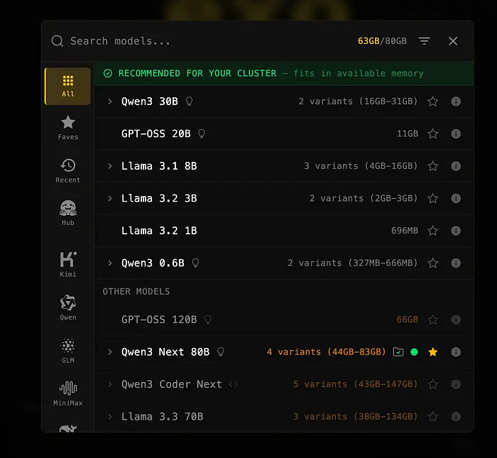 在下载之前,它会显示组合后的RAM以及可以在你的AI集群中运行的模型。